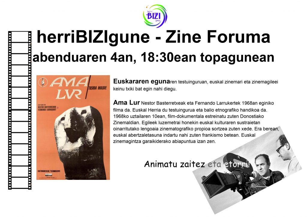 Abenduaren 4an, Euskararen Egunaren bueltan, beste Zine Forum saioa izango dugu Topagunean bertan 18:30etan. 1968an sortutako AMALUR film-dokumentala ikusi ahal izango dugu. Balio etnografiko handikoa, euskal kulturaren sustraietan oinarrituta, abertzaletasuna indartu nahi izan zuen frankismo betean.