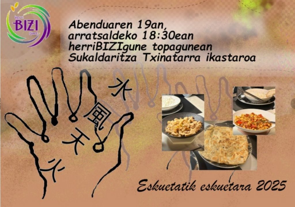 Herribizigunek beste saio berri bat prestatu du ESKUETATIK ESKUETARA programaren bidean. Oraingoan, abenduaren 19an, SUKALDARITZA TXINATARRAren inguruan jarduteko aukera izango dugu. Herritar guztiei zuzendutako saio irekia izango da, Herribiziguneko bazkide izan edo ez. Doakoa da, baina komeni da izena aldez aurretik ematea. Badakizu: 19 ostirala, 18:30etan, Herribiziguneren Topagunean bertan.